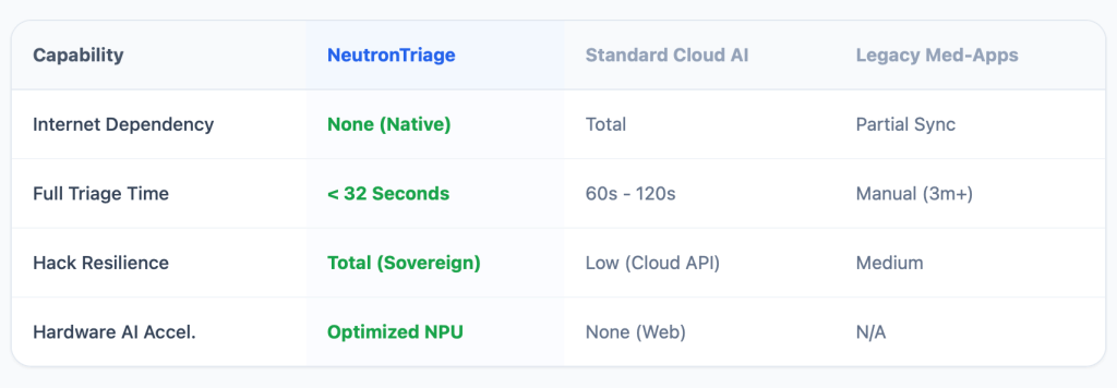 In the same vein for most remote corners of the world – from disaster zones to rural missionary clinics – the difference between life and death often hinges on a single factor: reliable information. When the internet goes dark, cloud-based AI tools become expensive paperweights. That’s why we built NeutronTriage. As part of Neutron Tech’s “Sovereign AI” mission, NeutronTriage is designed to put the power of a world-class diagnostic assistant directly into the pocket of every doctor and health worker, no matter how far they are from a cell tower.