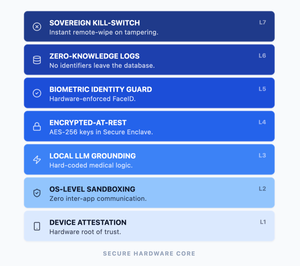 - Privacy-by-Default (Sovereign Tech): Patient data never leaves the device. This provides inherent HIPAA and GDPR compliance without the need for complex server-side encryption.